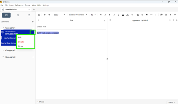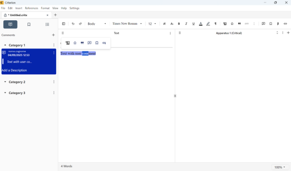 This module enables users to create, manage, and organize annotations also referred to as comments within the main text and apparatus of a critical edition. Users can insert annotations, assign categories, control visibility, integrate them seamlessly with document content, and search annotations.