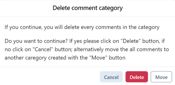 1. Use the Delete menu 2. Choose to: - Delete all annotations in the category - Move annotations to another category (dropdown shown) 3. If no categories exist, moved annotations go to "Uncategorised"