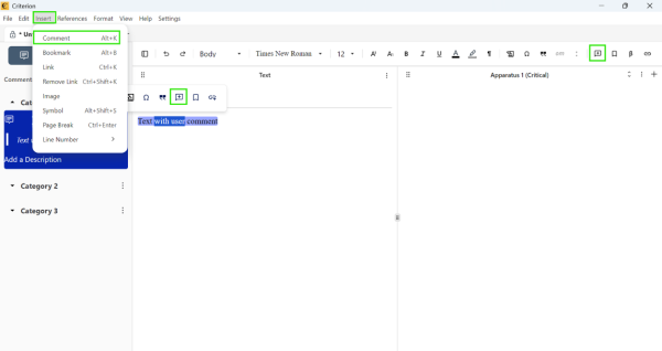 - Use the “Show Comment Highlights” checkbox in the main and apparatus editor: