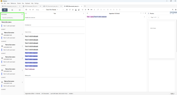Annotations can be searched directly within the editor using a dedicated search field located in the left sidebar, under the Comments section.