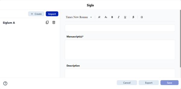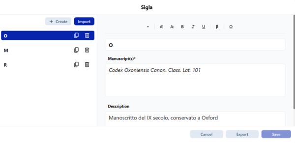 | Siglum Definition | ✅ Yes | 30 chars | Short ID (e.g., A, Vat. lat. 123). Supports superscript, symbols, different keyboards |