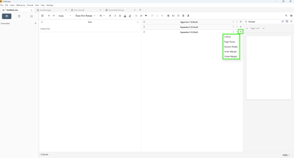 - Types available: Critical (default), Page Notes, Section Notes, Inner Margin, Outer Margin