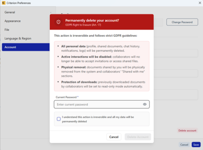 1. From the Account tab in Preferences, click Delete my account 2. In the confirmation modal: - Enter Current password - Check the mandatory checkbox: "I understand this action is irreversible and all my data will be permanently deleted" 3. Click Delete Account (enabled only if password is correct and checkbox is selected)
