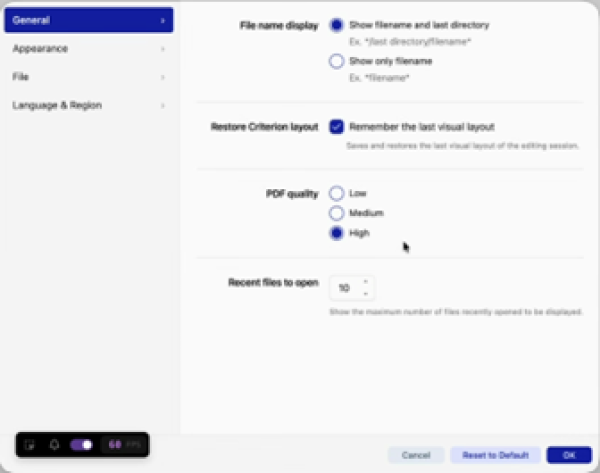 - Location: Settings > Preferences > General > Restore Criterion layout