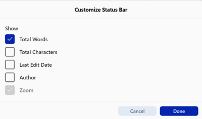 1. Go to: View > Customize Status Bar 2. Dialog box opens listing available items: - Total Words - Total Characters - Last Edit Date - Author 3. Check boxes next to items you want to display; uncheck those you don't need 4. Click OK to save