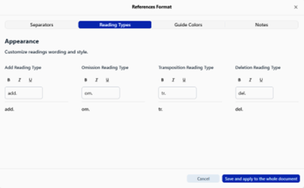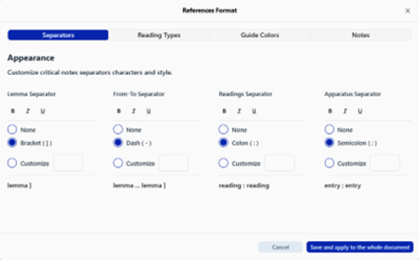 Customize default separators and font styles for key structural elements in apparatus notes. Changes apply consistently across editor view, print preview, printed documents, and PDF exports.