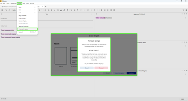 1. Go to Format > Change Template 2. Select the desired template 3. If the new template has fewer apparatus types, a warning will appear showing which content will no longer be visible 4. Confirm to apply changes (irreversible)