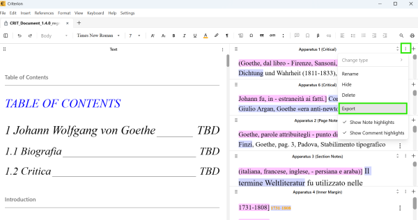 - Editing lemma in main body updates corresponding apparatus note automatically