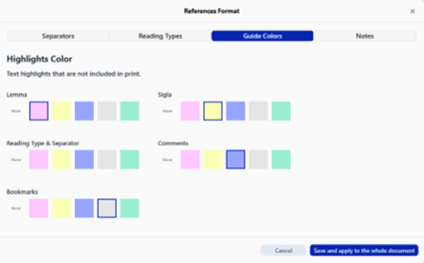 Managing Highlight Colors for Apparatus Notes, Comments, and Bookmarks