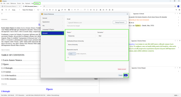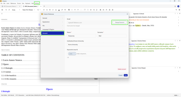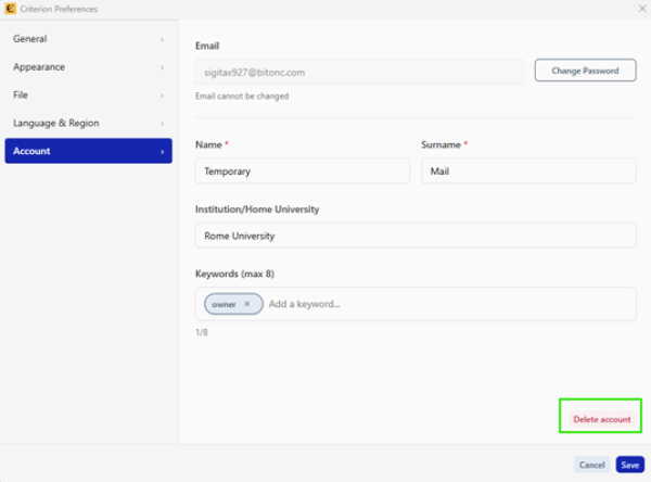 1. Open Settings → Preferences → Account tab 2. Click Edit Profile (top right) 3. Modify: - Name and Surname - Institution/Home University - Keywords (max 8) 4. The system automatically cleans redundant spaces and avoids duplicates among keywords 5. Click Done to save or Cancel to discard