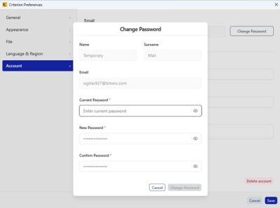 1. From the Account tab in Preferences, click Change Password 2. Complete the form with: - Current password - New password (must comply with security policy) - Confirm new password 3. Click Change Password 4. After confirmation: - The password is updated - A notification email is sent to the user - The user is automatically logged out - They must log in again with the new password