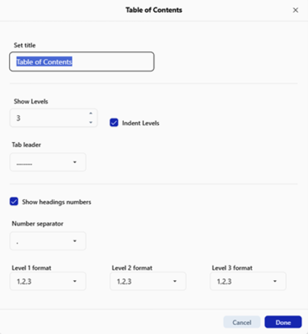 | Indentation | Enable or disable indented hierarchy (applies only to heading levels, not titles) |